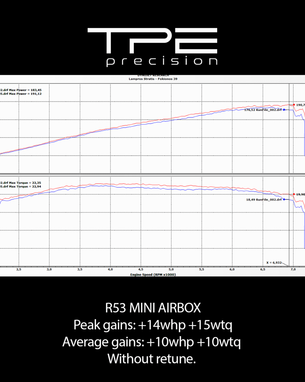 Across all tested conditions, the TPE Precision intake outperformed the OEM setup. Results remained stable even during heat-soaked pulls, delivering sharper throttle response, smoother mid-range power, and a raw, unmuffled supercharger tone up to 7000 RPM.